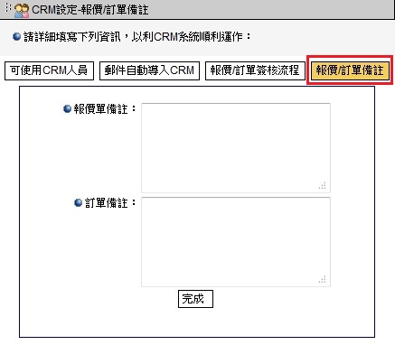 點選「報價/訂單備註」,將可填入於報價/訂單之備註欄位顯示的內容。