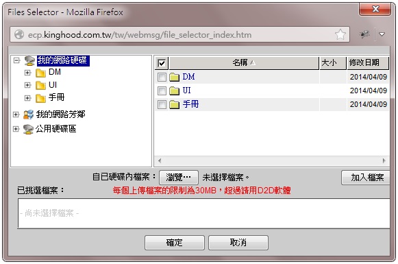 3. 勾選網路硬碟中的檔案,點「確定」,剛剛所選的檔案才會附加於此封信件【附加檔案列表】的欄位中。